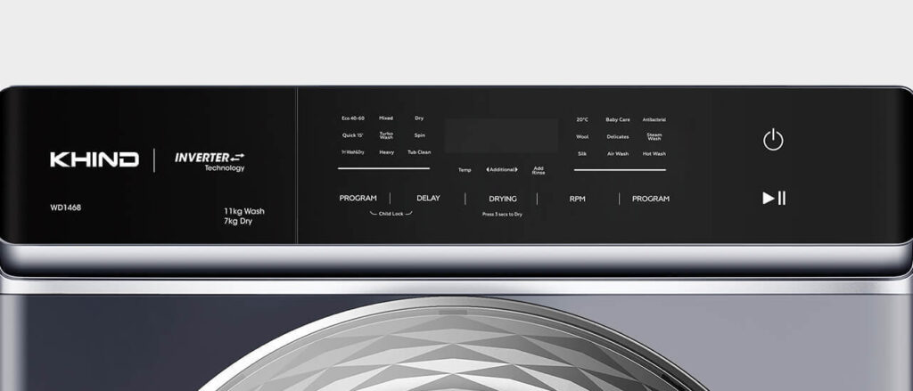 Kuasa berganda—KHIND 2-in-1 Washer Dryer tampil dengan 18 mod cucian, fungsi Steam Wash dan 1 Hour Wash & Dry. Lebih besar, lebih canggih, semua siap dalam satu sentuhan.
